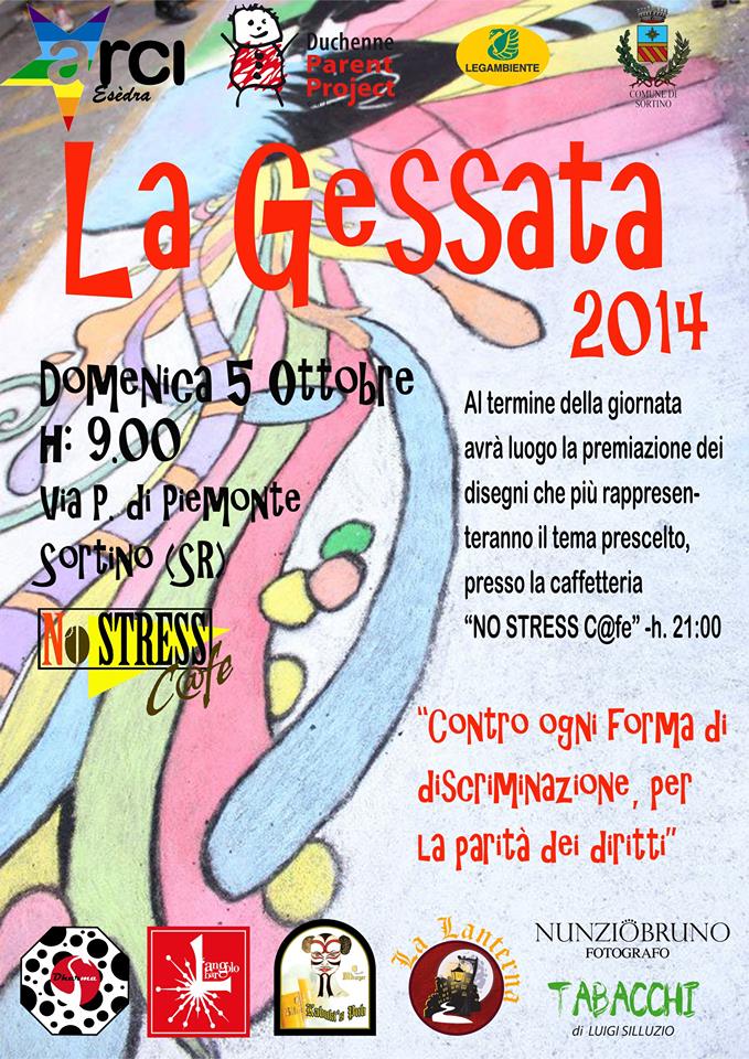 Domenica 5 Parent project organizzerà inoltre, insieme ad altre associazioni, “la Gessata” 2014 che vedrà impegnati tanti bambini a disegnere in strada ispirandosi a temi quali l’uguaglianza e la solidarietà.