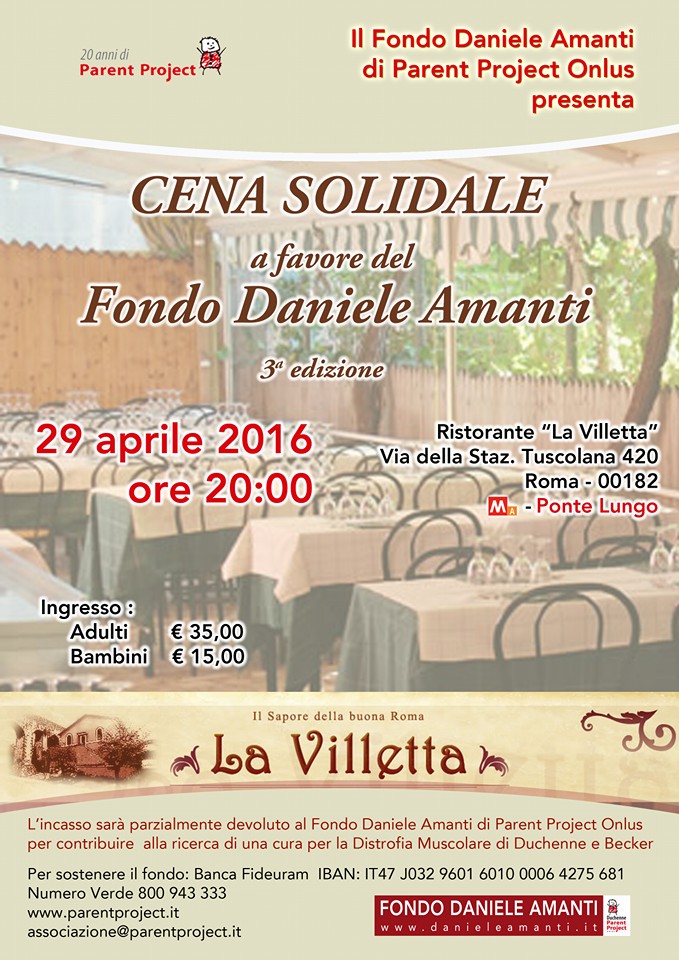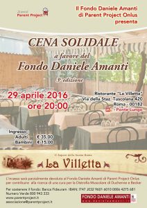 Si terrà venerdì 29 Aprile, a partire dalle ore 20:00, presso il ristorante “La villetta”, la cena solidale a favore del Fondo Daniele