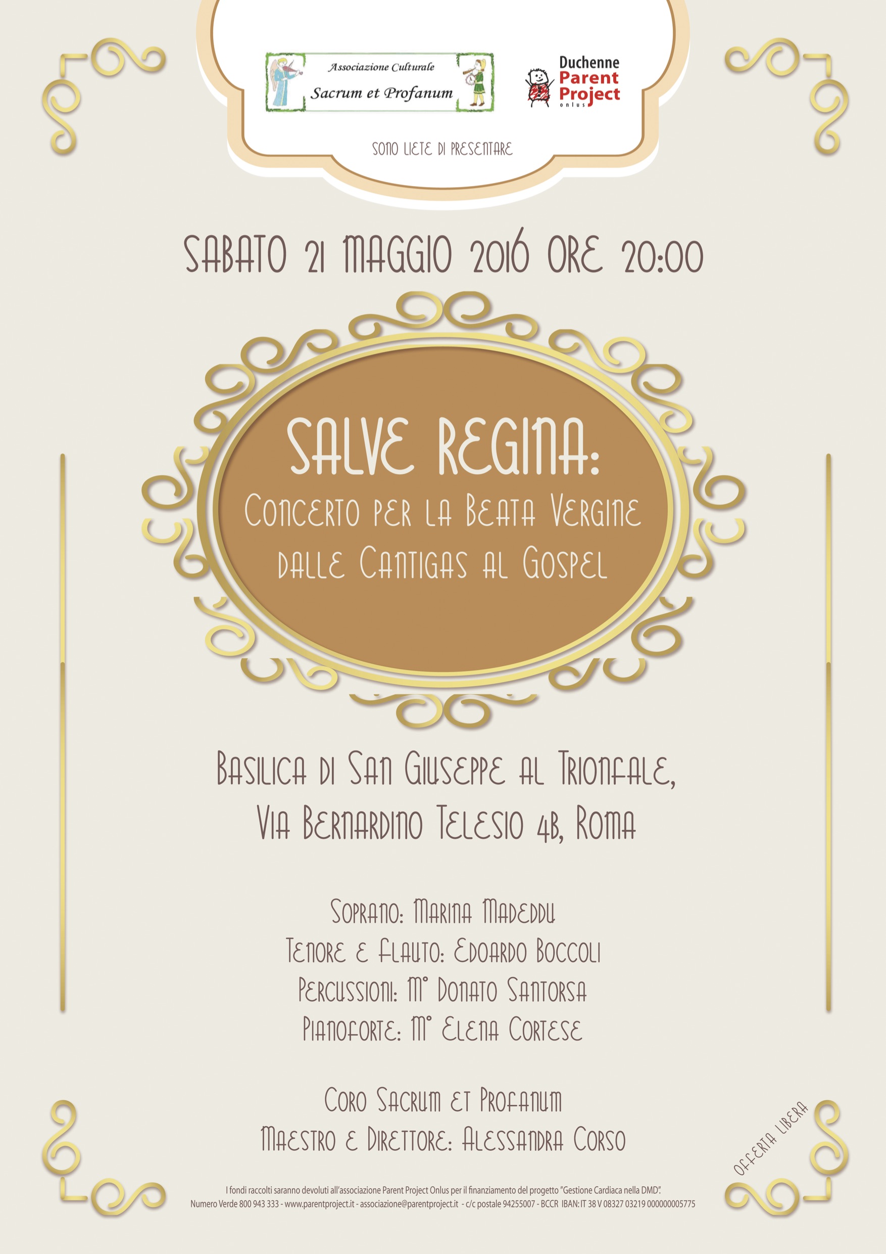 Sabato 21 maggio, presso la Basilica di San Giuseppe al Trionfale, si svolgerà “Salve Regina: concerto per la Beata Vergine dalle Cantigas al Gospel”, una serata di musica polifonica, organizzata dall’Associazione Culturale Sacrum et Profanum a favore di Parent Project onlus.