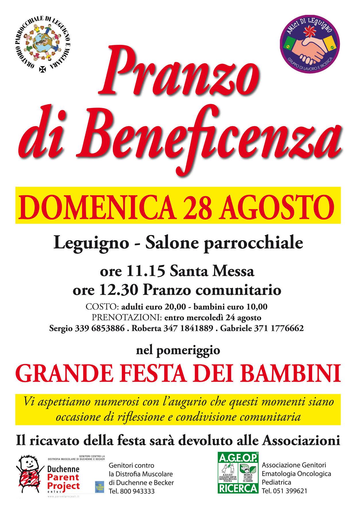 Domenica 28 agosto, alle ore 12.30, si svolgerà, presso la struttura parrocchiale di Leguigno, un pranzo solidale che andrà a sostenere l’operato di due associazioni: Parent Project onlus, dedicata al supporto della ricerca sulla distrofia muscolare di Duchenne, e l’Associazione Genitori Ematologia Oncologica Pediatrica.