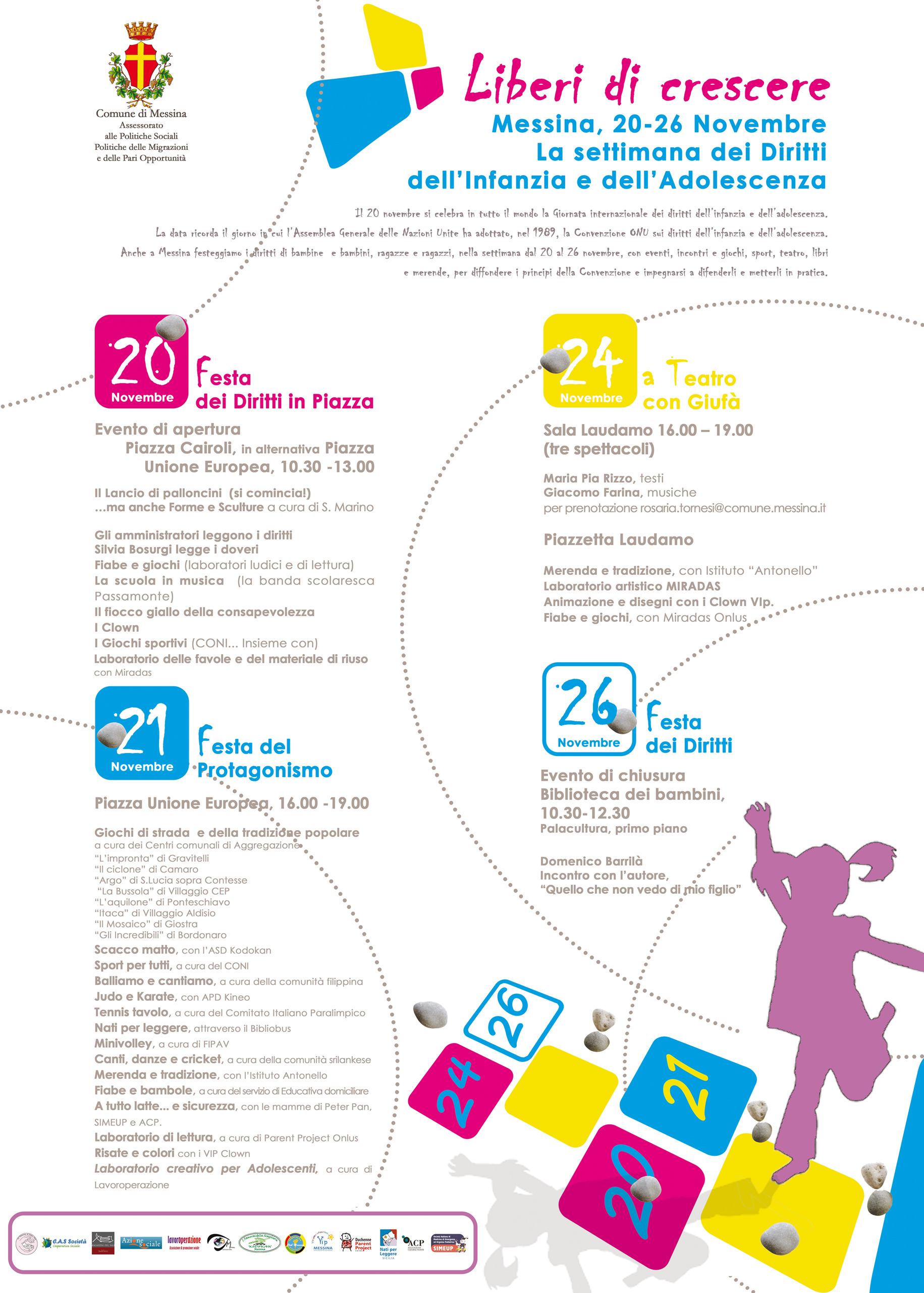 La convenzione ONU sui Diritti dell'infanzia fu approvata dall’Assemblea Generale delle Nazioni Unite il 20 novembre 1989. L’evento viene ricordato ogni anno, il 20 novembre appunto, nella Giornata internazionale per i diritti dell’infanzia e dell’adolescenza. L’Italia ha ratificato la Convenzione nel 1991. Ad essa non mancano mai di ispirarsi i pronunciamenti e gli atti dell’Europa in tema di infanzia.In onore di tale evento l’Assessore alle politiche sociali del Comune di Messina, Nina Santisi, ha organizzato, dal 20 al 27 Novembre, in collaborazione con le associazioni del territorio, una settimana dedicate interamente ai bambini. Anche Parent Project darà il suo contributo: lunedì 21 Novembre, alle ore 17, verrà proposto un incontro di lettura per bambini con disabilità, in gemellaggio con la biblioteca regionale Cannizzaro, presso Piazza Unione Europea. L’obiettivo è quello di creare un’occasione stimolante che consenta ai bambini di avere un canale di comunicazione privilegiato nell’esprimere e percepire le emozioni, e andare così alla scoperta delle proprie potenziali risorse. A rendere più festosa l’atmosfera, in piazza ci saranno clown, bande musicali e una golosa merenda!