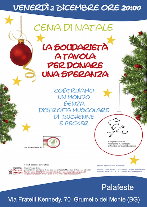 Ritorna venerdì 2 dicembre, presso il Palafeste di Grumello del Monte (BG), la tradizionale cena “La solidarietà a tavola per donare una speranza”, organizzata da soci e volontari dell’associazione Parent Project onlus.