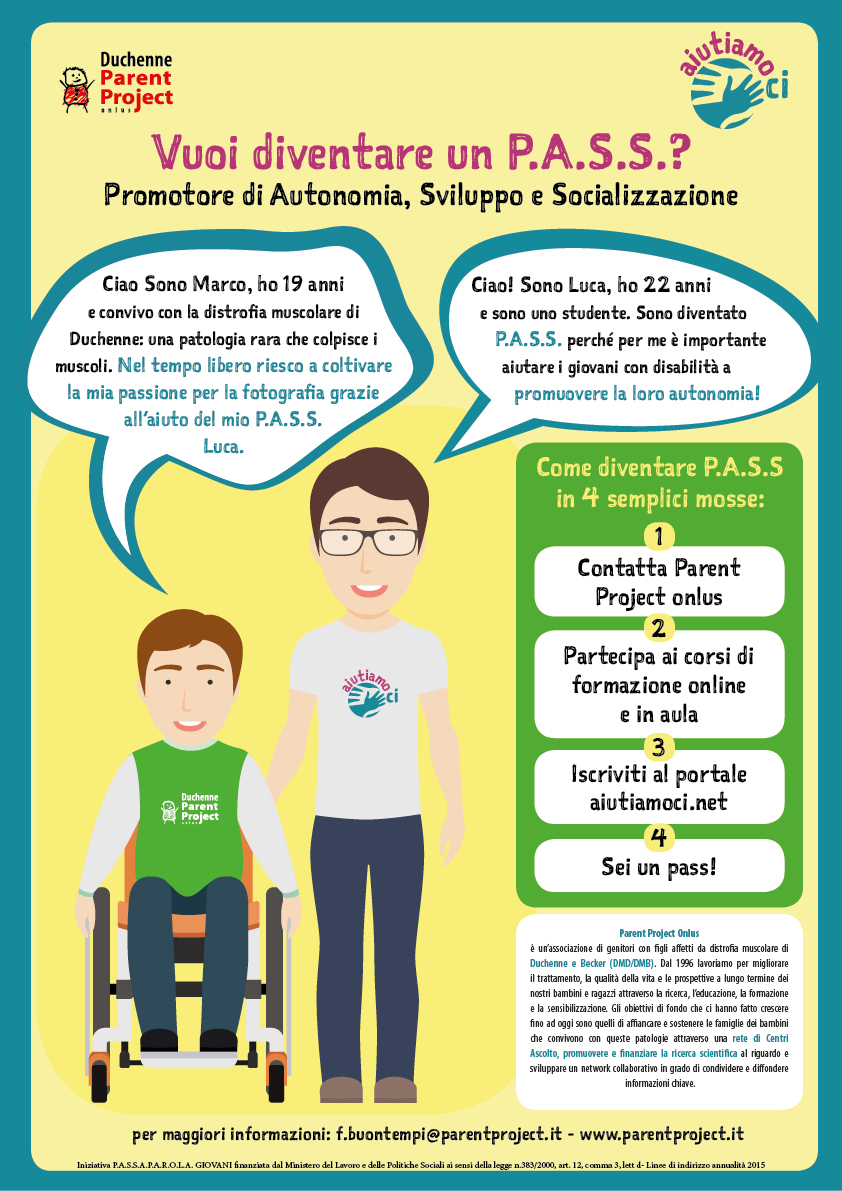 “P.A.S.S.A.P.A.R.O.L.A. GIOVANI” intende potenziare la capacità di impatto del portale su famiglie e territori, mediante l’implementazione di nuovi strumenti tecnologici e servizi social, e soprattutto attraverso un percorso di formazione nazionale rivolto ai soci, con particolare riferimento ai giovani di età non superiore ai 30 anni, da istruire all’inedita figura del Promotore di Autonomia, Sviluppo e Socializzazione (P.A.S.S.), in grado di offrire questo tipo di supporto alle famiglie con ragazzi affetti da distrofia muscolare di Duchenne e Becker.