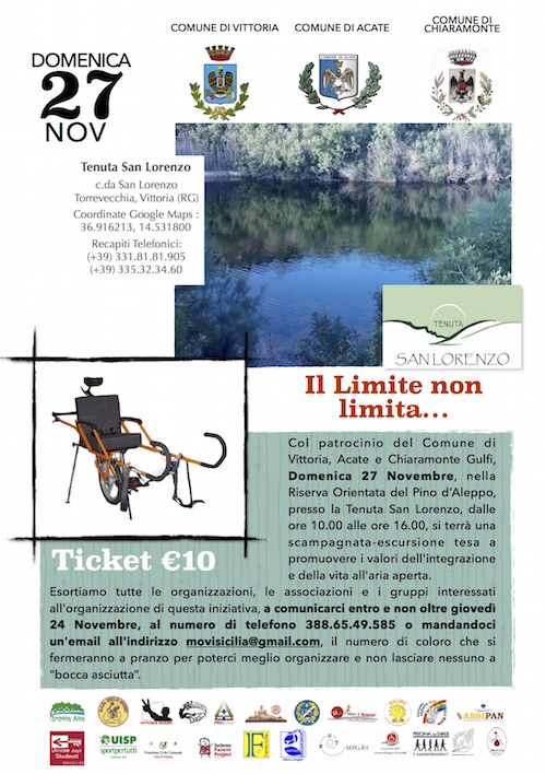 locandina-scampagnata-27-novembre-2016-2Domenica 27 novembre si svolgerà un’escursione accessibile nella Valle dell’Ippari, organizzata da MoVIS Onlus, con il patrocinio dei Comuni di Vittoria, Acate e Chiaramonte