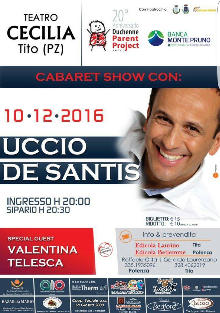 Sabato 10 dicembre 2016, dalle 20.30, presso il Teatro Cecilia di Tito (PZ) si terrà una grande serata dedicata al Cabaret, che avrà come protagonista l’attore Uccio De Santis, con la partecipazione