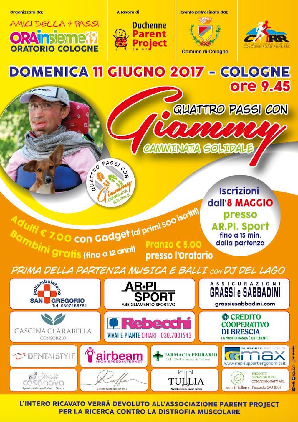 Dopo il grande successo delle edizioni 2015 e 2016, domenica 11 giugno a Cologne (BS) si svolgerà la terza camminata solidale non competitiva “Quattro passi con Giammy”, che quest’anno andrà a sostenere Parent Project onlus, per la ricerca scientifica sulla distrofia muscolare di Duchenne e Becker.