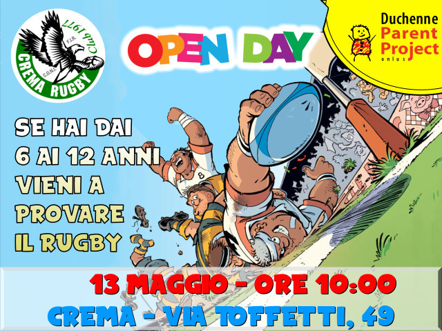 L’Open day è una giornata nel corso della quale tutti potranno sperimentare la pratica del rugby, giocando con la supervisione degli allenatori del Club. L’evento ha l’intento di diffondere la conoscenza e il gioco del rugby a Crema e nel Cremasco. In parallelo, si svolgerà un torneo per bambini delle categorie Under 6/8/10/12.