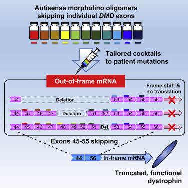 Per superare questo aspetto, un team internazionale di ricercatori (Canada, Giappone, Francia e Gran Bretagna) ha puntato a una strategia di multiexon skipping utilizzando un cocktail di diverse molecole di tipo PMO per eliminare in un colpo solo il blocco di esoni 45-55. Lo studio è stato pubblicato lo scorso luglio sulla rivista scientifica Molecular Therapy  . L’obiettivo di questa strategia è la produzione di una variante della distrofina che pur essendo più corta mantiene la sua funzionalità e che è nota per essere presente in diversi pazienti che hanno un quadro clinico eccezionalmente attenuato. Rappresenterebbe inoltre un potenziale trattamento per più della metà della popolazione Duchenne (fino al 65%) che includerebbe non solo i pazienti che hanno delezioni ma anche quelli con duplicazioni e mutazioni puntiformi in questa regione del gene.