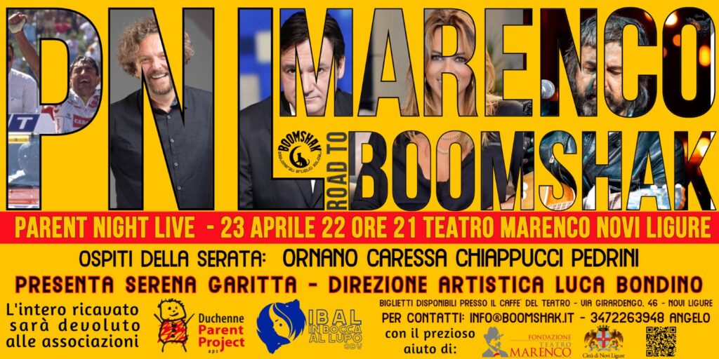 Sarà sabato 23 aprile al Teatro Marenco di Novi Ligure la prima edizione di Parent Night Live – Road to Boomshak 2022: una serata di intrattenimento a 360 gradi finalizzata a raccogliere fondi per le attività sociali di Parent Project aps e di In Bocca al Lupo odv, associazioni attive nel territorio alessandrino.
