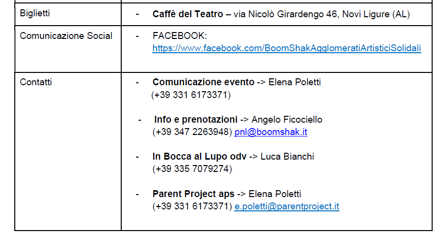 I biglietti, per assistere allo spettacolo, saranno disponibili su donazione fino ad esaurimento posti, presso il Caffè del Teatro in via Girardengo 46 a Novi Ligure (AL). La donazione contribuirà alla realizzazione dei progetti delle due Associazioni coinvolte.