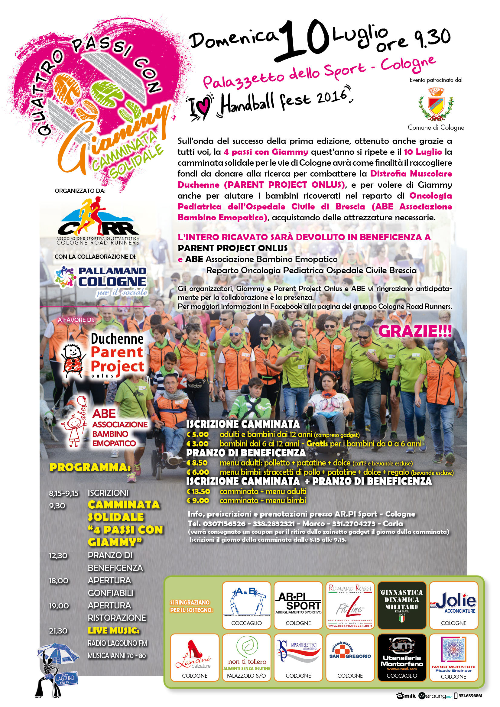 Dopo il grande successo dell’edizione 2015, domenica 10 luglio a Cologne (BS) si svolgerà la seconda camminata solidale non competitiva “Quattro passi con Giammy”, che quest’anno andrà a sostegno di due realtà non profit: Parent Project onlus, per la ricerca scientifica sulla distrofia muscolare di Duchenne e Becker, e l’Associazione Bambino Emopatico, attiva presso il Reparto di Oncologia pediatrica dell’Ospedale civile di Brescia.