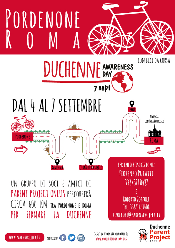 Tra loro, un gruppo di circa 25 soci e amici dell’associazione Parent Project, invece, percorrerà, dal 4 al 7 settembre, circa 600 km da Pordenone a Roma in bici da strada, con tappe a Ravenna, Città di Castello e Terni, con l’obiettivo di arrivare in piazza San Pietro mercoledì 7 settembre, raggiungendo una delegazione di Parent Project che parteciperà ad un’udienza con Papa Francesco.