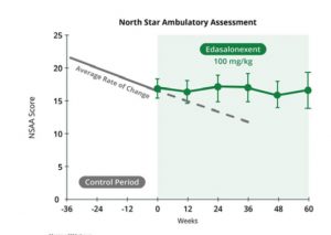 Nella fase 2 e nello studio di estensione in aperto dello studio clinico MoveDMD, una conservazione della funzione muscolare e un rallentamento della progressione della patologia DMD è stata vista nei ragazzi trattati con edasalonexent paragonati ai tassi di cambiamento durante il periodo di controllo prima di ricevere edasalonexent. Durante le 60 settimane di trattamento, il gruppo trattato con 100 mg/kg/die ha mostrato miglioramenti costanti e clinicamente significativi nei tassi di declino paragonati ai tassi di cambiamento durante il periodo di controllo attraverso le quattro valutazioni della funzione muscolare: i tre test a tempo (camminata/corsa per 10 metri, salita dei 4 gradini, tempo per alzarsi) come anche la “North Star Ambulatory Assessment” (NSAA), una valutazione globale integrata della funzione muscolare.