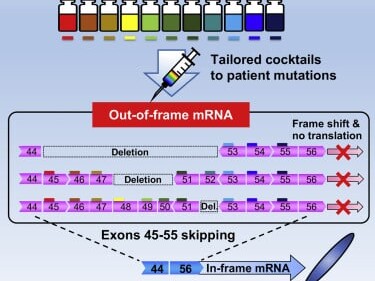 Per superare questo aspetto, un team internazionale di ricercatori (Canada, Giappone, Francia e Gran Bretagna) ha puntato a una strategia di multiexon skipping utilizzando un cocktail di diverse molecole di tipo PMO per eliminare in un colpo solo il blocco di esoni 45-55. Lo studio è stato pubblicato lo scorso luglio sulla rivista scientifica Molecular Therapy . L’obiettivo di questa strategia è la produzione di una variante della distrofina che pur essendo più corta mantiene la sua funzionalità e che è nota per essere presente in diversi pazienti che hanno un quadro clinico eccezionalmente attenuato. Rappresenterebbe inoltre un potenziale trattamento per più della metà della popolazione Duchenne (fino al 65%) che includerebbe non solo i pazienti che hanno delezioni ma anche quelli con duplicazioni e mutazioni puntiformi in questa regione del gene.