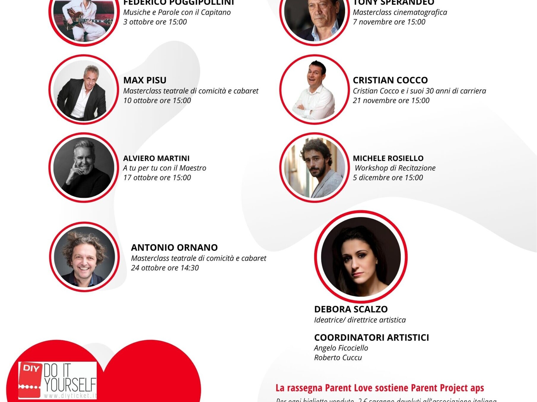 La prima parte della stagione si svolgerà dal 3 ottobre al 5 dicembre 2020 presso il Teatro Ambra di Alessandria. Si tratta di un progetto importante, voluto fortemente dalla direttrice artistica (da alcuni anni testimonial di Parent Project), per poter unire per la prima volta una Stagione Artistica Culturale al mondo del sociale. Parent Love devolverà 2€ per ogni biglietto venduto a Parent Project aps, per sostenere la ricerca scientifica e la speranza di un futuro di qualità per i bambini e i giovani che convivono con la distrofia muscolare di Duchenne e Becker. La Rassegna vedrà nomi illustri calcare il palco: il grande cantautore Federico Poggipollini con “Musiche e Parole con il Capitano”, i super comici Max Pisu e Antonio Ornano terranno “Masterclass Teatrali di Comicità e Cabaret”, l’attore Premio David di Donatello Tony Sperandeo terrà la “Masterclass Cinematografica”, l’amato e storico inviato di Striscia la Notizia Cristian Cocco ripercorrerà i suoi 30 anni di carriera con la sua “Masterclass Televisiva”, l’attore napoletano di serie di successo come “Gomorra”, “L’isola di Pietro” e “La compagnia del Cigno” Michele Rosiello terrà la “Masterclass di Recitazione”, mentre il grande stilista Alviero Martini si racconterà