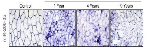 Con il progredire della distrofia muscolare di Duchenne (DMD), i livelli di RNA benefico (in viola) nei muscoli, chiamato miR-206, si riducono. Per lo studio i ricercatori sono stati capaci di incrementare la quantità di miR-206 nelle vescicole extracellulari in cellule staminali di tessuto muscolare permettendo la rigenerazione dei muscoli.