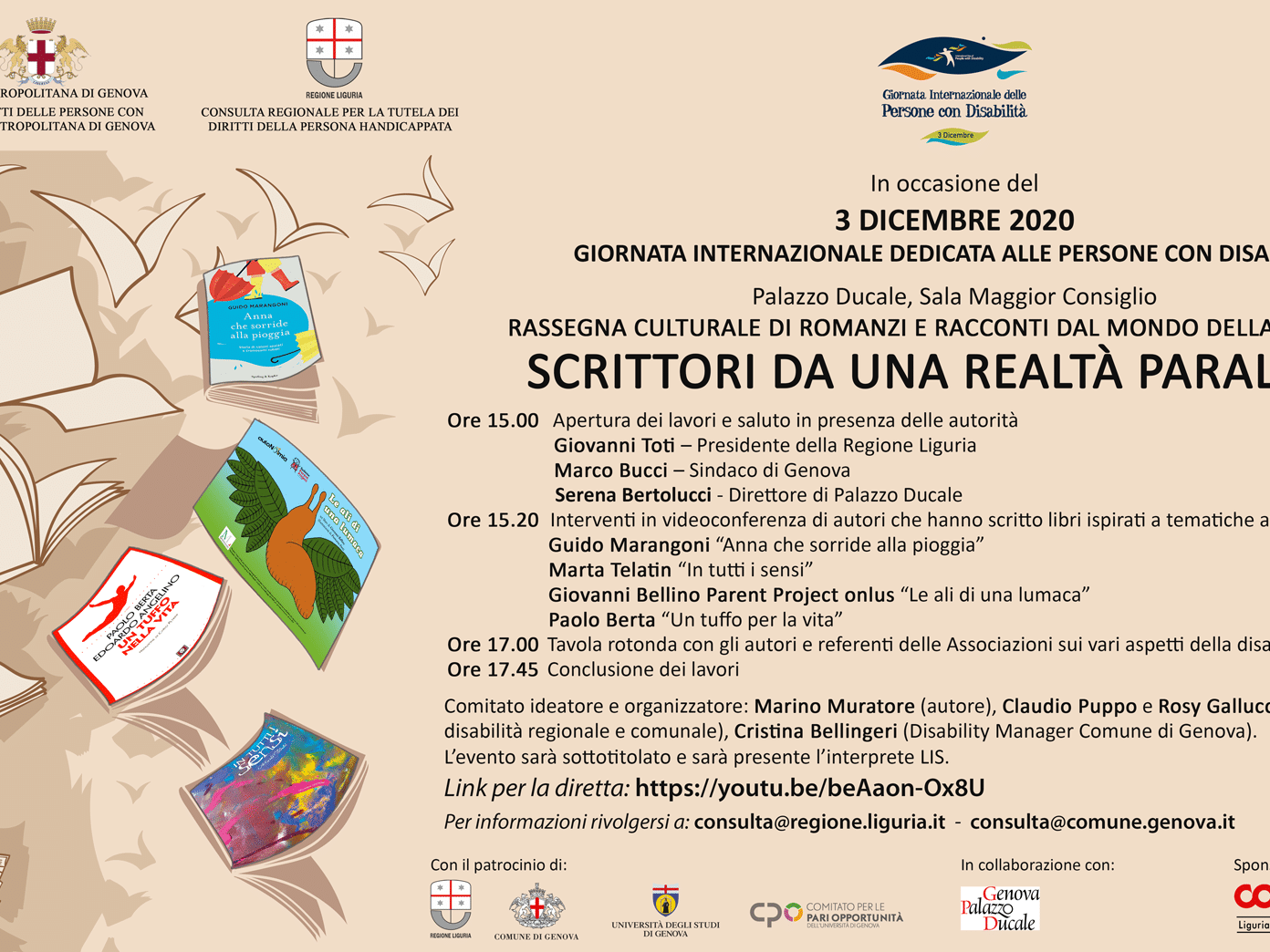 In occasione della Giornata internazionale dedicata alle persone con disabilità, giovedì 3 dicembre dalle ore 15 si svolgerà “Scrittori da una realtà parallela”, un incontro al quale parteciperà, in veste di autore, anche il nostro socio Giovanni Bellino. L’evento verrà trasmesso in diretta sulla pagina YouTube del Palazzo Ducale di Genova.