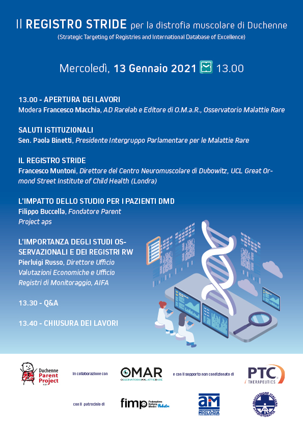 Si svolgerà mercoledì 13 Gennaio, alle ore 13, l’evento online di presentazione de “Il REGISTRO STRIDE per la distrofia muscolare di Duchenne” organizzato da Parent Project in collaborazione con O.M.a.R., Osservatorio Malattie Rare ed il contributo non condizionato di PTC Therapeutics Italy.