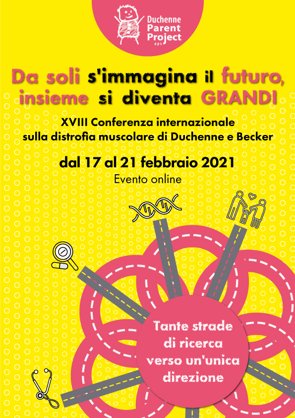 Claim della conferenza 2021 sarà “Da soli s’immagina il futuro, insieme si diventa grandi” con il sottotitolo “Tante strade di ricerca verso un’unica direzione”, a sottolineare la fondamentale dinamica di convergenza e interrelazione tra i tanti attori che oggi compongono la comunità Duchenne: pazienti, familiari, ricercatori, clinici, company, volontari.