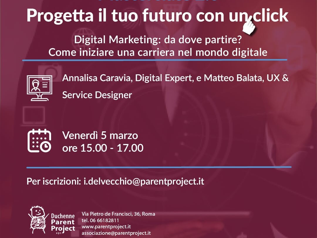 Venerdì 5 marzo, dalle 15 alle 17, si terrà la terza Masterclass del progetto “Masterclass 2.0: progetta il tuo futuro con un click”, dedicato ai giovani della nostra comunità.