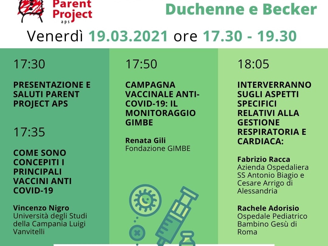 Venerdì 19 marzo alle ore 17.30 si terrà un webinar, organizzato da Parent Project aps e rivolto alla comunità dei pazienti, dedicato al tema dei vaccini anti COVID-19.