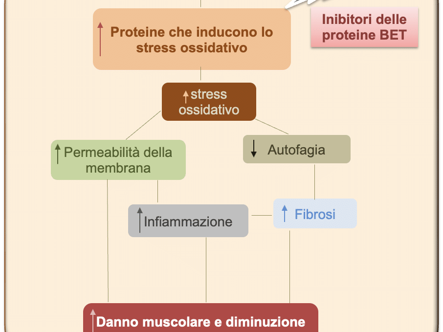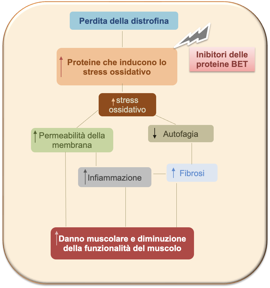Come mostrato in figura, i dati sperimentali ottenuti nel modello mdx e nei modelli cellulari mostrano come gli inibitori delle proteine BET possano essere considerati modulatori importanti dello stress ossidativo e di conseguenza dei molteplici processi coinvolti nella fisiopatologia della distrofia di Duchenne.