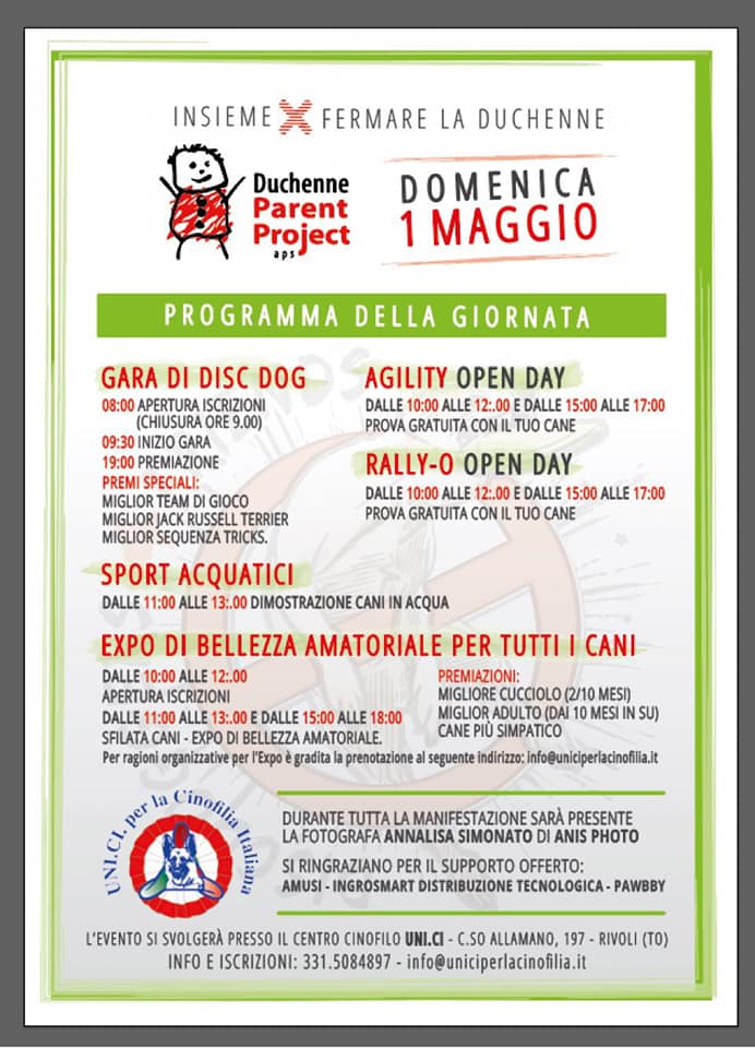 Si svolgerà domenica 1 maggio, dalle 9 alle 19, Disc doggers 4 friends, una manifestazione organizzata dall’associazione Uni.ci per la Cinofilia Italiana a sostegno di Parent Project aps, l’associazione di pazienti e genitori di figli con distrofia muscolare di Duchenne e Becker.