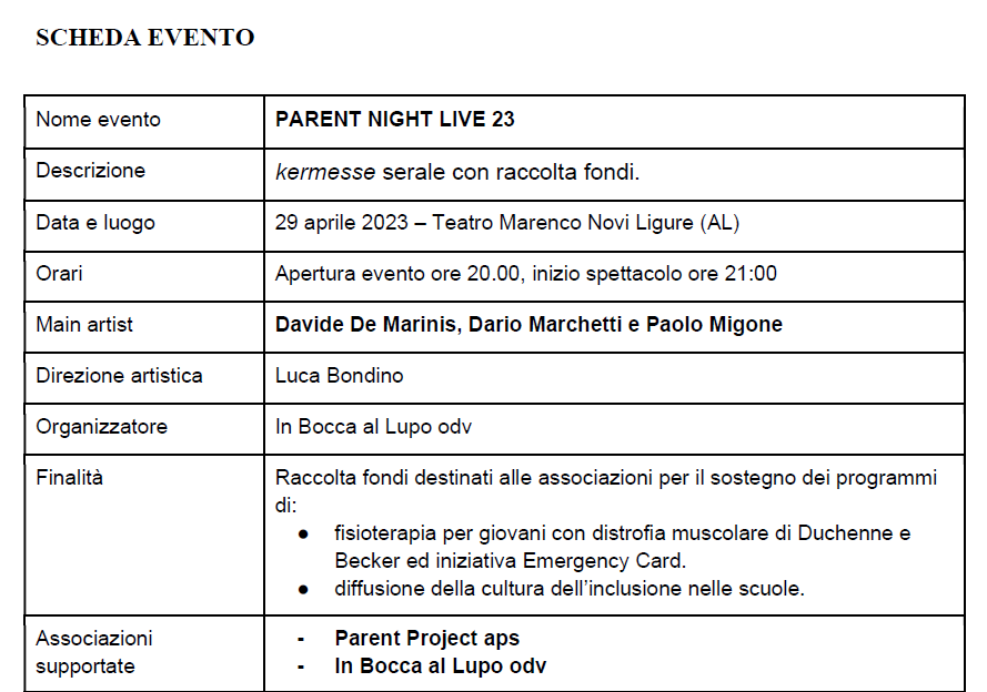 L’evento è organizzato dall’associazione In Bocca al Lupo odv con il supporto di Parent Project aps ed è patrocinata per il secondo anno consecutivo dal Comune di Novi Ligure.