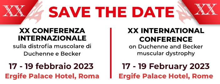 we are very happy to inform you that the 20th International Conference on Duchenne and Becker muscular dystrophy organized by Parent Project aps, will be held from the 17th to the 19th of February 2023 in Rome, at Ergife Palace Hotel, Via Aurelia 619 (www.ergifepalacehotel.com).