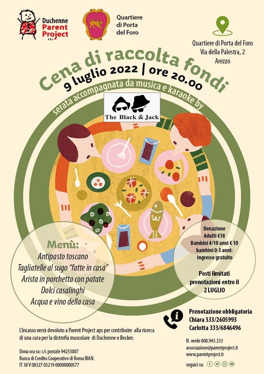 Sabato 9 luglio alle ore 20, presso il Quartiere Porta del Foro di Arezzo, in via della Palestra, 2, si terrà una nuova edizione della cena solidale dedicata a Parent Project aps.