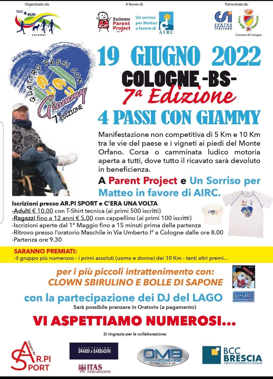 Domenica 19 giugno ritorna la 4 passi con Giammy, la grande manifestazione non competitiva solidale che coinvolge da anni il paese di Cologne (BS), organizzata dal gruppo Trek&Run.
