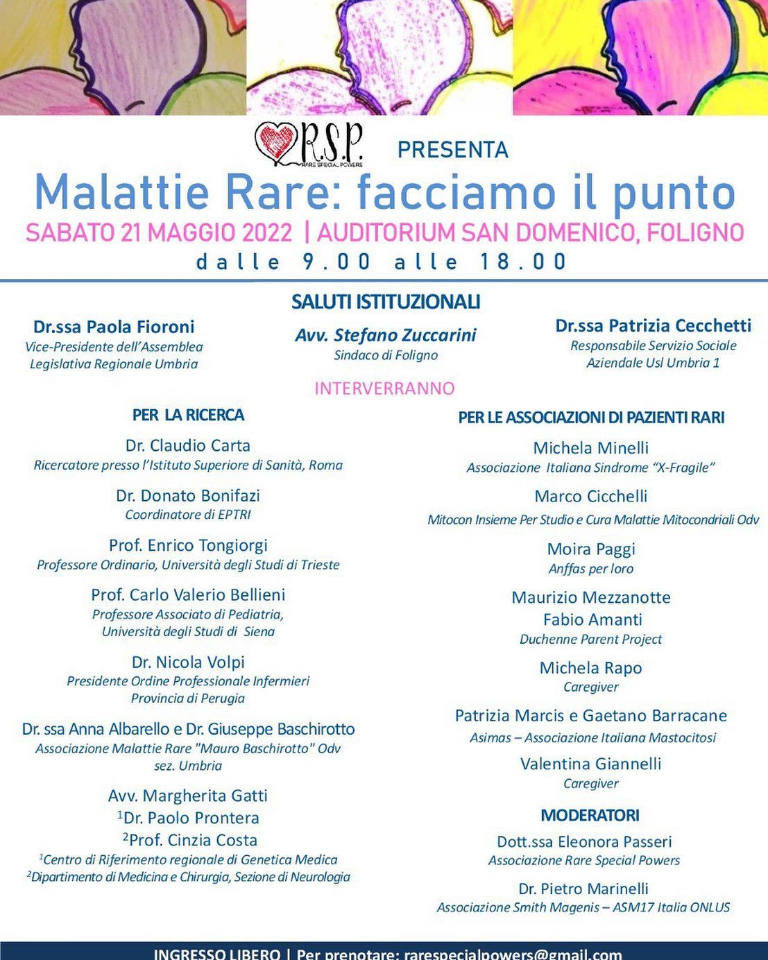 L’associazione Rare Special Power - RSP APS, in collaborazione con altre associazioni di pazienti rari della Regione Umbria, organizzano sabato 21 maggio 2022 una giornata di confronto e spunti di riflessioni sul tema delle malattie rare e la ricerca portata avanti presso l’Auditorium San Domenico a Foligno (PG).