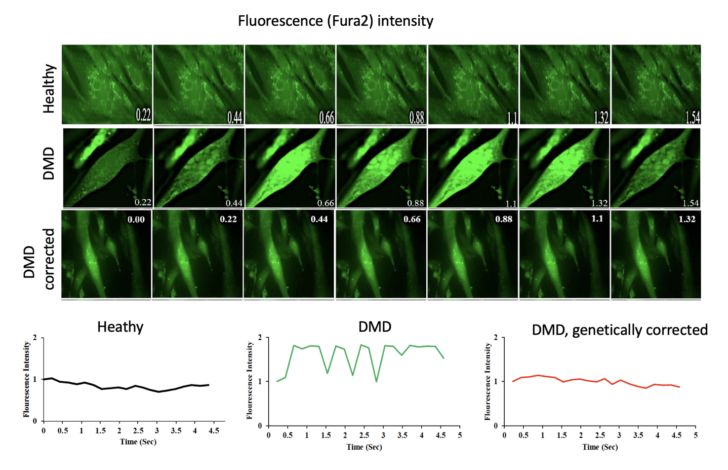 La prima osservazione è stata la presenza di flussi di ioni calcio nelle cellule muscolari DMD in coltura, non appena si differenziano, prima che diventino capaci di contrarsi. Le cellule derivate da muscoli sani non mostrano questi flussi. Quando le cellule distrofiche venivano corrette geneticamente così da esprimere la distrofina, i flussi di calcio scomparivano.