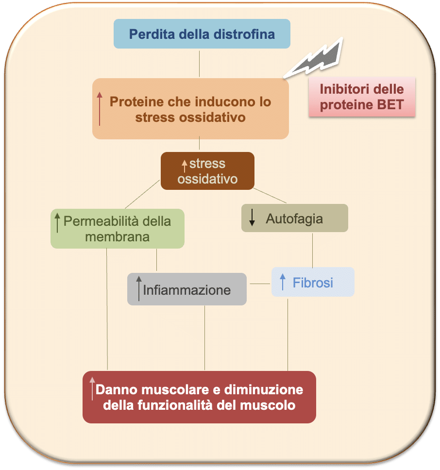 Come mostrato in figura, i dati sperimentali ottenuti nel modello mdx e nei modelli cellulari mostrano come gli inibitori delle proteine BET possano essere considerati modulatori importanti dello stress ossidativo e di conseguenza dei molteplici processi coinvolti nella fisiopatologia della distrofia di Duchenne.