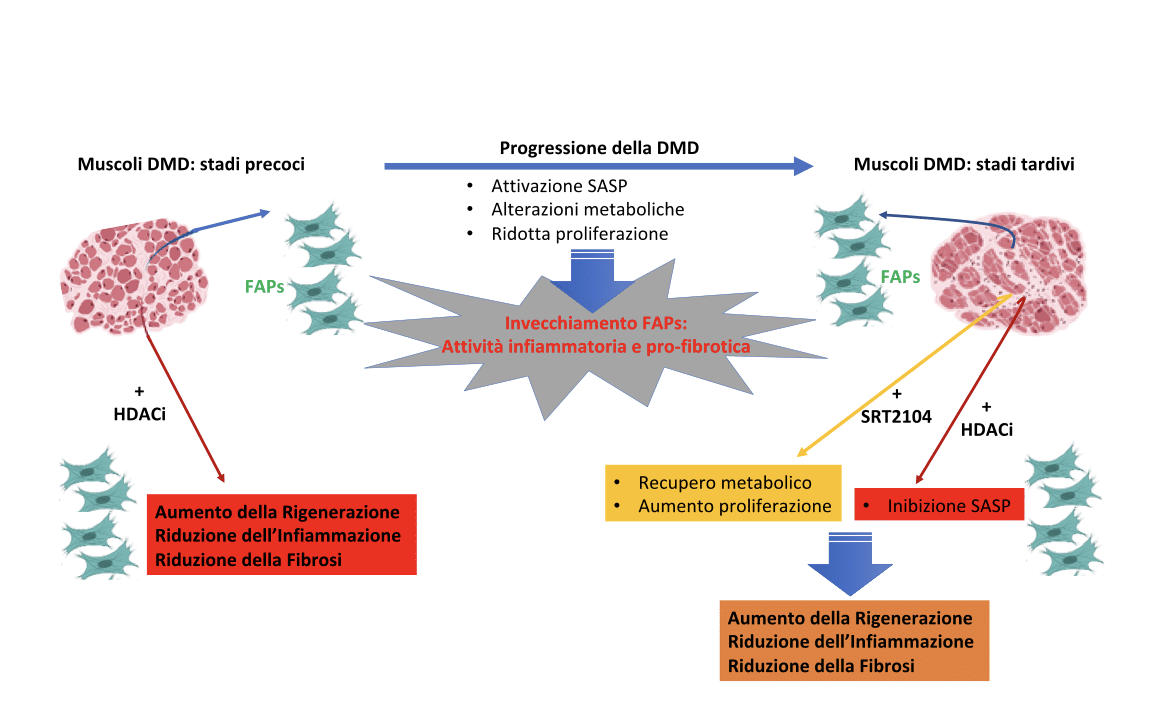 Il trattamento farmacologico della distrofia muscolare di Duchenne (DMD) con inibitori delle istone deacetilasi (HDACi) è attualmente in fase di sperimentazione in studi clinici di fase 3 con il farmaco givinostat; tuttavia, studi preclinici in modelli animali della DMD (topi mdx) hanno indicato che gli effetti benefici degli HDACi sono limitati agli stadi iniziali della malattia e vengono mediati prevalentemente da una popolazione cellulare, i progenitori fibroadipogenici (FAPs), che si trova negli interstizi del tessuto muscolare, dove svolge un ruolo chiave durante la rigenerazione muscolare (Mozzetta et al., 2013; Saccone et al., 2014). In particolare, gli HDACi inducono i FAPs a mantenere un’azione pro-rigenerativa e prevengono la loro conversione in effettori cellulari della degenerazione fibro-adiposa dei muscoli. Tuttavia questi effetti terapeutici degli HDACi sono circoscritti alle fasi precoci della patologia. La perdita degli effetti benefici degli HDACi, osservata negli stadi più avanzati della DMD, è almeno in parte dovuta allo sviluppo di una resistenza dei FAPs agli HDACi (Mozzetta et al., 2013; Saccone et al., 2014).