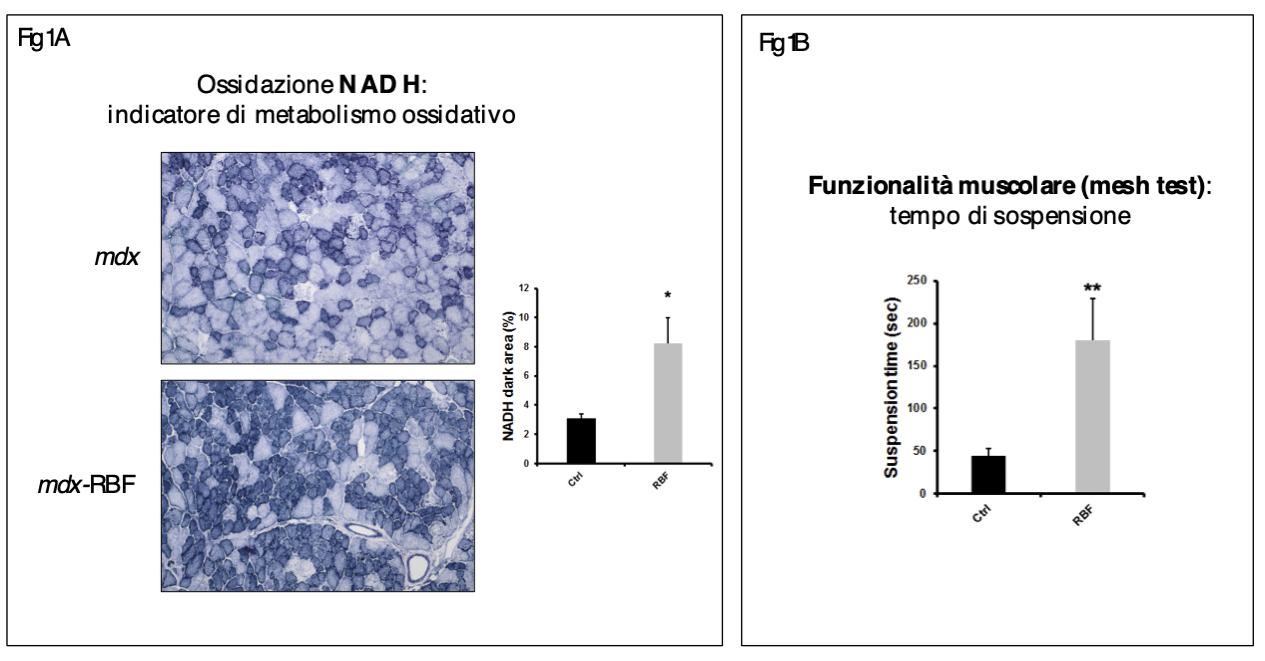 Riboflavina-5’-fosfato (1mg/topo/die; somministrazione intraperitoneale) - In seguito ai trattamenti con riboflavina-5’-fosfato, sia quello breve che quello lungo, il numero di fibre ossidative è aumentato in maniera considerevole (figura 1A) con una riduzione della fibrosi, dell'espressione del collagene e dell'infiltrato infiammatorio. Rispetto al trattamento breve, il trattamento lungo ha mostrato, inoltre, un maggiore e significativo incremento della funzionalità muscolare (figura 1B) e un aumento dei livelli di marcatori anti-infiammatori come Arginasi-1 e CD163. Inoltre, è risultata evidente e statisticamente significativa la riduzione delle fibre necrotiche in seguito al trattamento con riboflavina-5’-fosfato.
