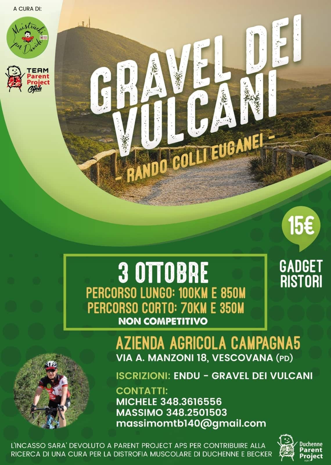 Si svolgerà domenica 3 ottobre, con partenza da Vescovana (PD), la Gravel dei Vulcani: una Randonnée off-road sui Colli Euganei organizzata dal gruppo Maistrachi per Davide in collaborazione con il Team Parent Project asd.
