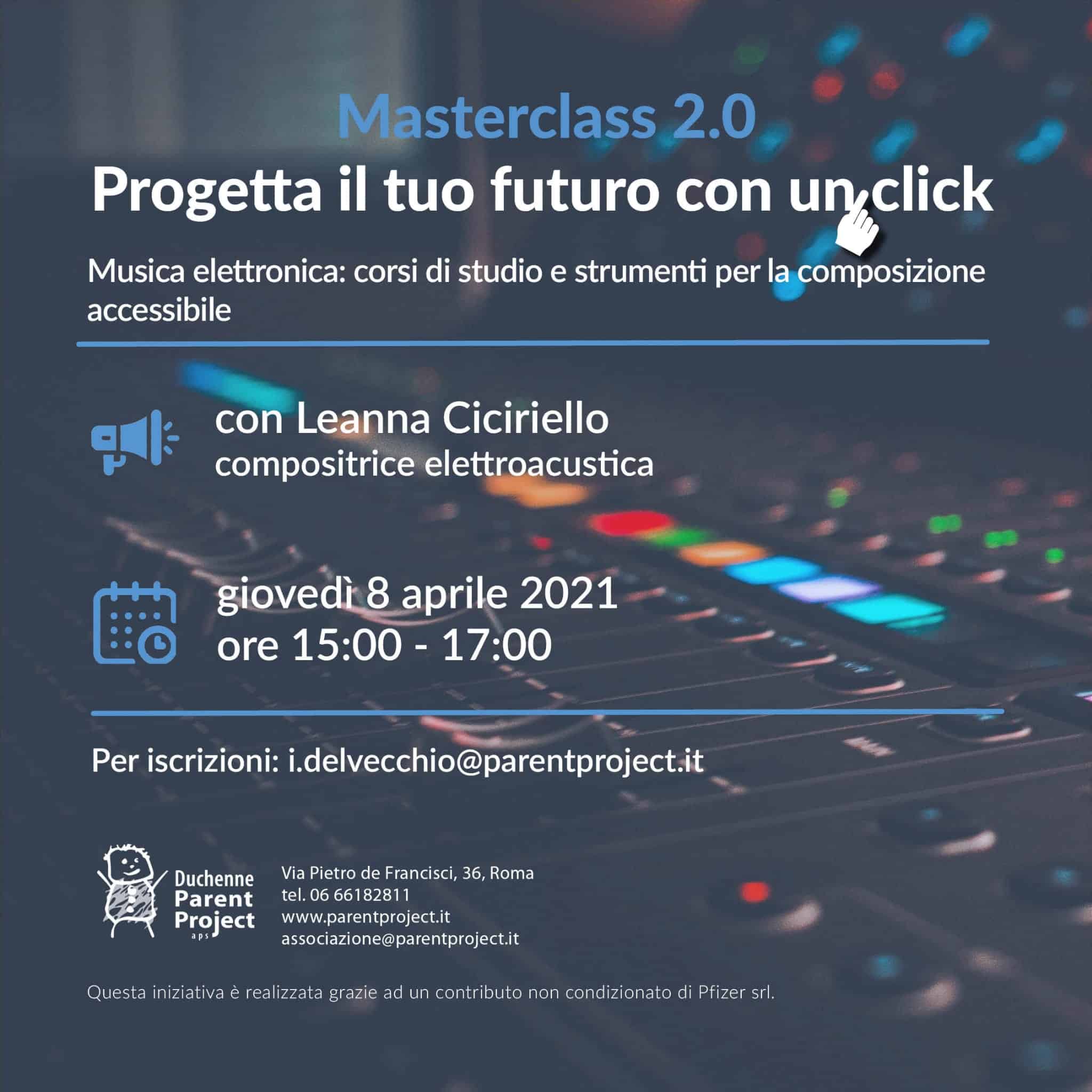 E' in arrivo giovedì 8 aprile una nuova Masterclass nell’ambito del progetto “Masterclass 2.0: progetta il tuo futuro con un click”, aperto ai giovani della nostra comunità. L'incontro "Musica elettronica: corsi di studio e strumenti per la composizione accessibile" sarà condotto da Leanna Ciciriello, compositrice elettroacustica, e si svolgerà dalle 15.00 alle 17.00 sulla piattaforma Zoom.