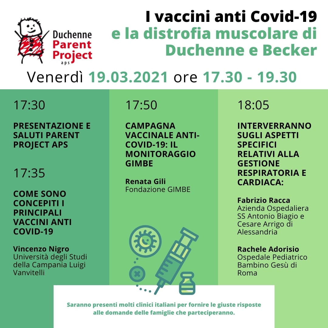 Il webinar vuole offrire uno spazio di approfondimento dedicato al tema vaccini che, seppure con modalità e tempistiche diverse da regione a regione, inizia finalmente a coinvolgere anche la nostra comunità di pazienti DMD/BMD.