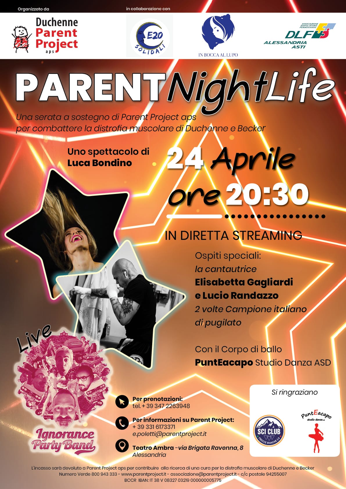 L’associazione In Bocca al Lupo, con il gruppo Luna Eventi, con PuntEacapo Studio Danza asd e con il Dopolavoro Ferroviario di Alessandria, sta organizzando insieme a Parent Project “Parent Night Life”, una serata di varietà dedicata alla nostra associazione.