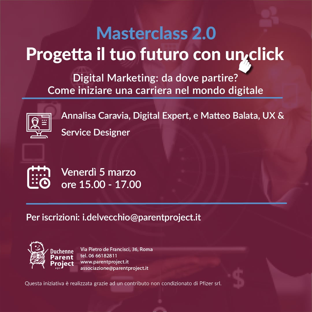 Venerdì 5 marzo, dalle 15 alle 17, si terrà la terza Masterclass del progetto "Masterclass 2.0: progetta il tuo futuro con un click", dedicato ai giovani della nostra comunità.