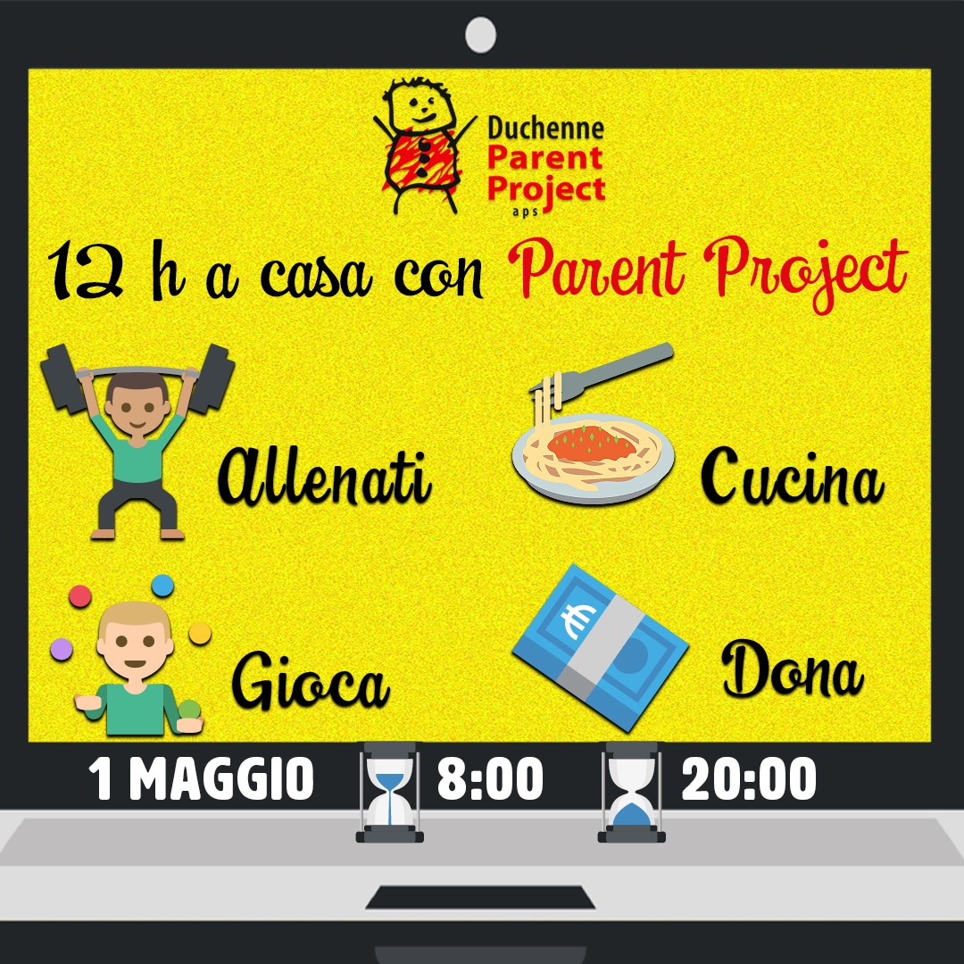 - L'evento "12h a casa con Parent Project" si terrà venerdì 1° Maggio dalle ore 8.00 alle ore 20.00. E' un'iniziativa di raccolta fondi e sensibilizzazione che si svolgerà online, a sostegno dell'associazione.