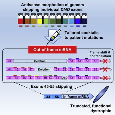 Per superare questo aspetto, un team internazionale di ricercatori (Canada, Giappone, Francia e Gran Bretagna) ha puntato a una strategia di multiexon skipping utilizzando un cocktail di diverse molecole di tipo PMO per eliminare in un colpo solo il blocco di esoni 45-55. Lo studio è stato pubblicato lo scorso luglio sulla rivista scientifica Molecular Therapy . L’obiettivo di questa strategia è la produzione di una variante della distrofina che pur essendo più corta mantiene la sua funzionalità e che è nota per essere presente in diversi pazienti che hanno un quadro clinico eccezionalmente attenuato. Rappresenterebbe inoltre un potenziale trattamento per più della metà della popolazione Duchenne (fino al 65%) che includerebbe non solo i pazienti che hanno delezioni ma anche quelli con duplicazioni e mutazioni puntiformi in questa regione del gene.