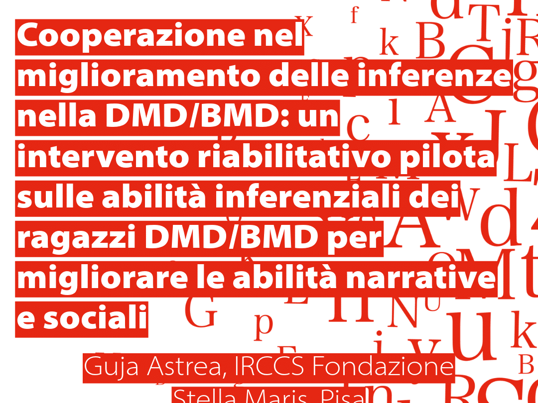 Negli ultimi due decenni l’attenzione del mondo scientifico in ambito DMD/BMD si è focalizzata non solo sugli aspetti motori ma anche sul funzionamento cognitivo e neuropsicologico e sulle ripercussioni che tali difficoltà, possono avere sulla qualità della vita e sulle capacità adattive di questi soggetti. In particolare è stato dimostrato che possono essere presenti alcune difficoltà nel linguaggio orale e nelle funzioni esecutive, che possono manifestarsi con cadute nelle capacità inferenziali e dialogiche. La nostra proposta di progetto consiste nell’attivazione di un trattamento logopedico pilota su un campione di ragazzi preadolescenti e adolescenti frequentanti la scuola secondaria, con capacità cognitive non verbali entro i limiti della norma e consiste in un intervento settimanale effettuato con materiale accattivante e interessante (giochi di ruolo, scambi conversazionali tematici, costruzione di fumetti o trailer di video) adattato e personalizzato in base agli interessi dei soggetti. L’intervento è mirato al rafforzamento delle abilità linguistiche più complesse, con l’obiettivo di migliorare le competenze di elaborazione del linguaggio, le capacità dialogiche, le abilità inferenziali con ricaduta secondaria sul favorire una miglior regolazione emotivo-affettiva e, indirettamente, migliorare le competenze scolastiche e sociali. Dopo questa esperienza, una volta affinate le proprie capacità inferenziali e narrative, i ragazzi saranno in grado di realizzare un proprio fumetto/video che possa trasmettere il loro messaggio e che possa essere il fulcro, non solo di gratificazione, ma anche di divulgazione del proprio lavoro.