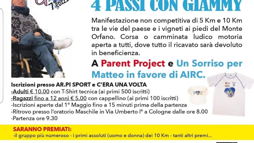 Domenica 19 giugno ritorna la 4 passi con Giammy, la grande manifestazione non competitiva solidale che coinvolge da anni il paese di Cologne (BS),…