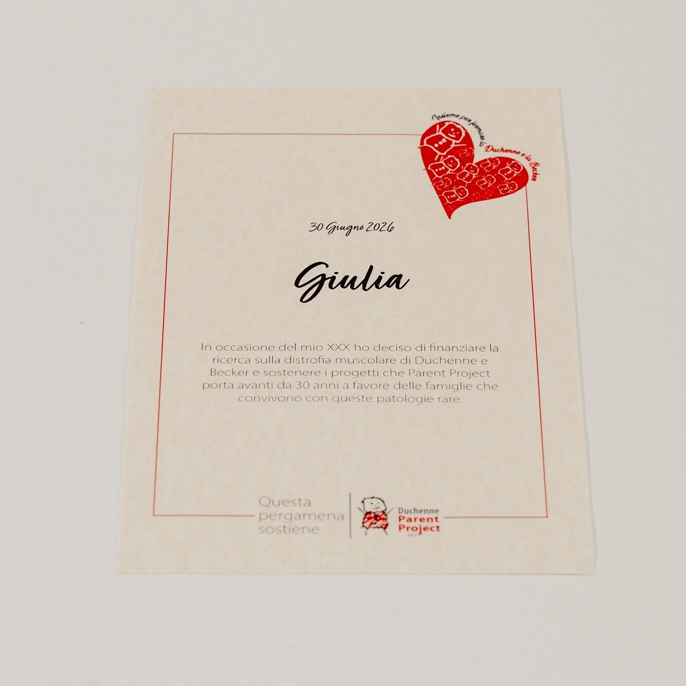 Parent Project potrà fornire una ricevuta della donazione al fine di favorirla in sede di dichiarazione dei redditi ma ricordiamo che la ricevuta emessa non ha valore legale se non accompagnata dall’evidenza postale o bancaria della transazione.