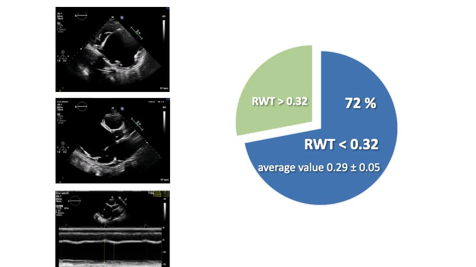 Figura 1: RWT (spessore di parete regionale, parametro usato per esprimere il pattern geometrico del ventricolo sinistro) <0,32 è indice di atrofia cardiaca. Età media dei 45 pazienti: 10.3 anni (±2,9 anni); 72% di essi presentava RWT < 0,32 (0,29 ± 0,05) alla prima valutazione