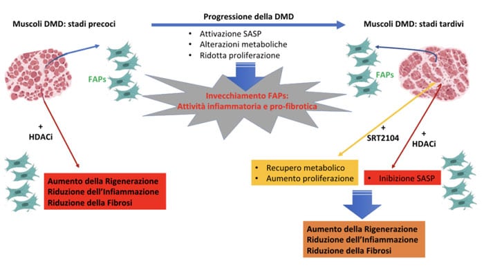 Questi dati rivelano che, durante la progressione della DMD, i FAPs sviluppano caratteristiche associate alla patologia che ricordano la senescenza, ovvero l’invecchiamento cellulare. La ridotta proliferazione e l’attivazione della SASP nei FAPs risultano, inoltre, eventi distinti correlati alla patologia e farmacologicamente dissociabili. Infatti, mentre gli HDACi falliscono nel ripristinare le capacità proliferative dei FAPs, riescono a inibire la SASP suggerendo che il trattamento possa mantenere l’effetto anti-fibrotico e anti-infiammatorio anche a stadi tardivi della patologia (Consalvi et al., 2021).
